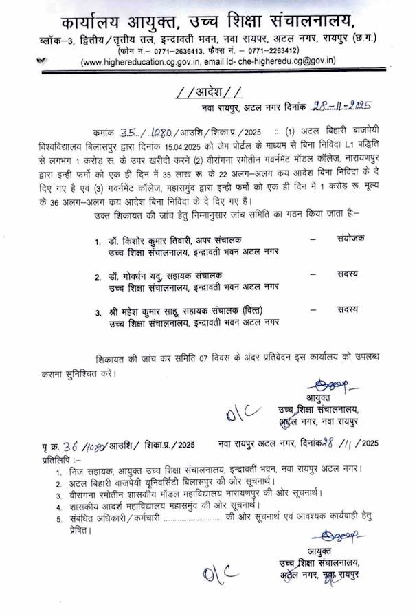 रायपुर, जेम पोर्टल के माध्यम से प्रदेश के कुछ यूनिवर्सिटी व कॉलेजों के द्वारा की जा रही सामग्रियों की खरीदी में संगठित भ्रष्टाचार का आरोप है. इन आरोपों की जांच के लिए आयुक्त, उच्च शिक्षा संचालनालय ने तीन सदस्यीय कमेटी का गठन किया है, जो 7 दिनों के अंदर अपनी रिपोर्ट पेश करेगी.