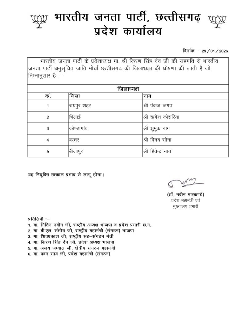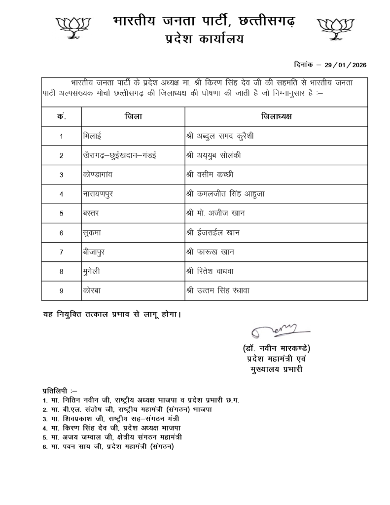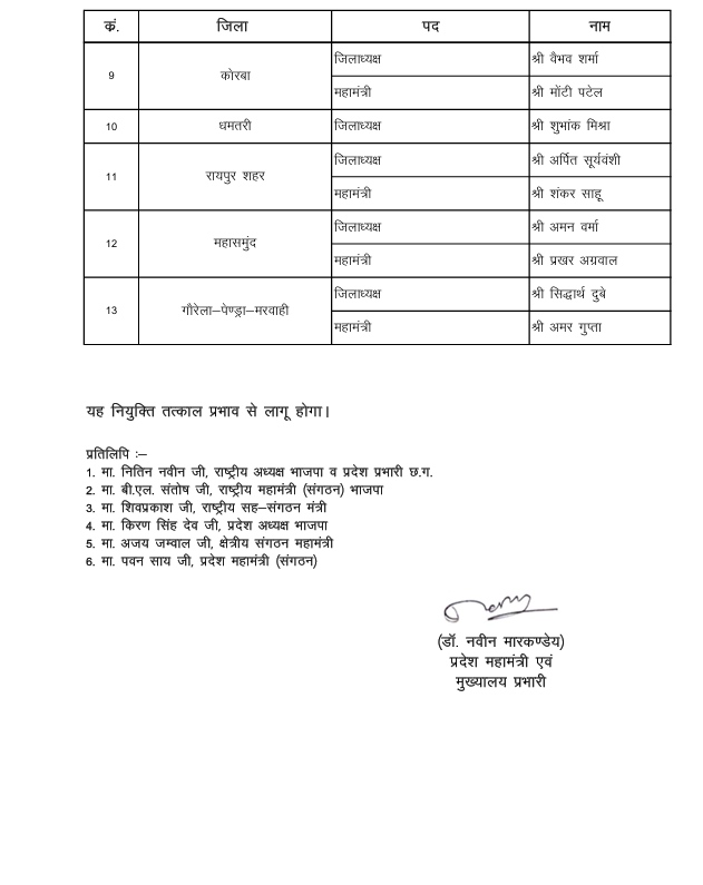 रायपुर, भारतीय जनता पार्टी के अल्पसंख्यक मोर्चा, अनुसूचित जाति (अजा) मोर्चा और युवा मोर्चा में जिला अध्यक्षों और महामंत्रियों की नियुक्तियां की गई है. यह नियुक्तियां पार्टी के प्रदेश अध्यक्ष किरण सिंह देव की सहमति से की गई है. यह नियुक्ति तत्काल प्रभाव से प्रभाव से लागू किया गया है.