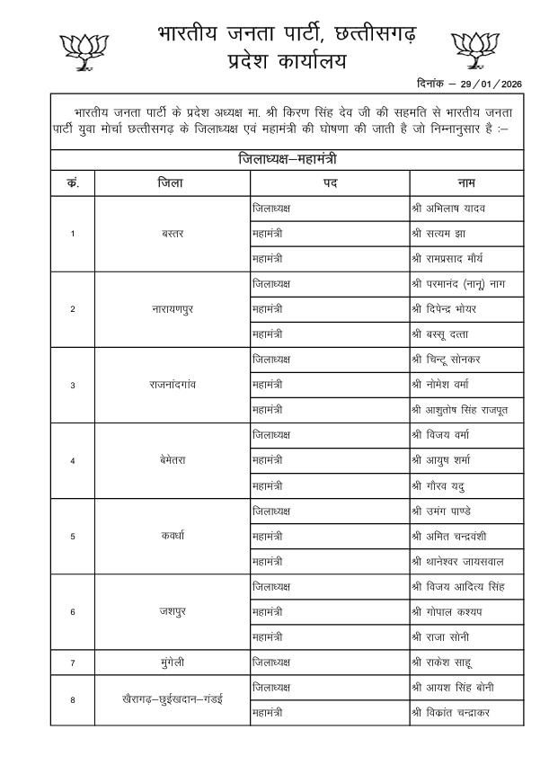 जारी लिस्ट में अल्पसंख्यक मोर्चा के 9 जिला अध्यक्ष, अनुसूचित जाति मोर्चा के 5 जिला अध्यक्षों और युवा मोर्चा में 13 जिला अध्यक्षों के साथ महामंत्रियों को नियुक्त किया गया है.