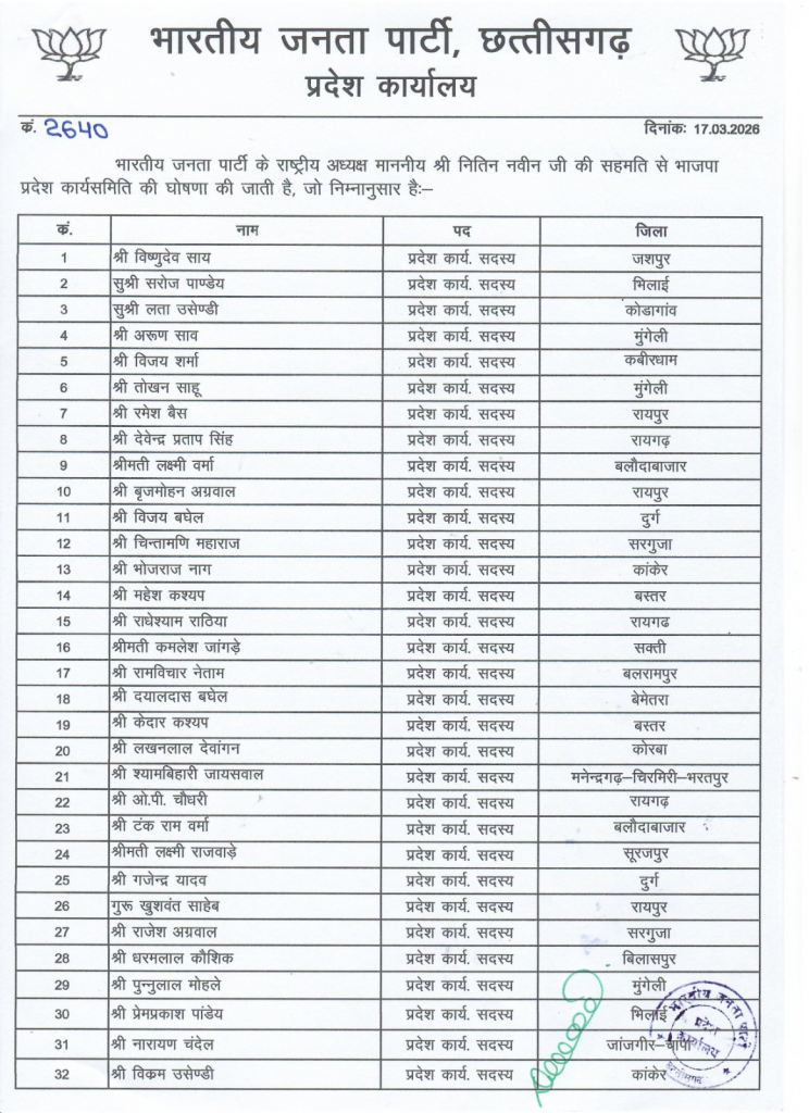 रायपुर, छत्तीसगढ़ बीजेपी ने प्रदेश कार्यसमिति घोषित कर दी है. भारतीय जनता पार्टी के राष्ट्रीय अध्यक्ष नितिन नबीन की सहमति के बाद 84 सदस्यों की सूची जारी कर दी गई है. इस सूची में सीएम विष्णुदेव साय, डिप्टी सीएम और मंत्रियों समेत कई नेताओं को जिम्मेदारी सौंपी गई है. इसके साथ ही प्रदेश स्थायी आमंत्रित सदस्य और प्रदेश विशेष आमंत्रित सदस्य की लिस्ट जारी की है.