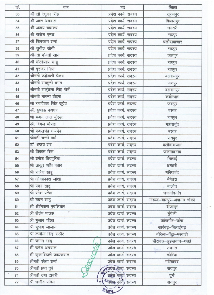 बीजेपी प्रदेश अध्यक्ष किरण सिंह देव ने कार्यसमिति की सूची जारी की. इसमें क्षेत्रीय संतुलन को साधने की कोशिश की गई है. मुख्यमंत्री विष्णुदेव साय को जशपुर, सरोज पांडेय को भिलाई, लता उसेंडी को कोंडागांव, डिप्टी सीएम अरुण साव को मुंगेली, उपमुख्यमंत्री विजय शर्मा को कबीरधाम और केंद्रीय राज्य मंत्री तोखन साहू को मुंगेली की जिम्मेदारी सौंपी गई है. इस लिस्ट में कैबिनेट मंत्री, सांसद और विधायकों को कमान दी गई है.