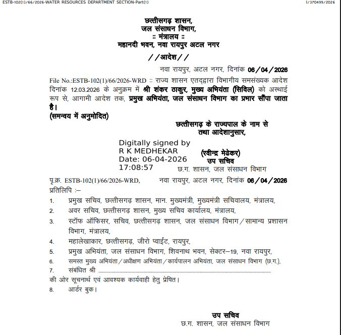 GOVT; जल संसाधन विभाग में बड़ा फेरबदल, शंकर ठाकुर बने प्रमुख अभियंता,6 CE को मिली नई जिम्मेदारी