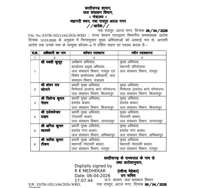 जारी आदेश के अनुसार, शंकर ठाकुर (मुख्य अभियंता, सिविल) को अस्थायी रूप से आगामी आदेश तक प्रमुख अभियंता, जल संसाधन विभाग का प्रभार सौंपा गया है। साथ ही 6 मुख्य अभियंताओं की नई पदस्थापना की गई है।