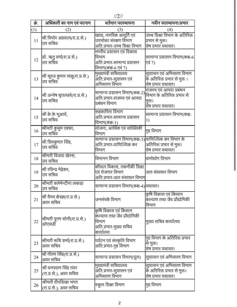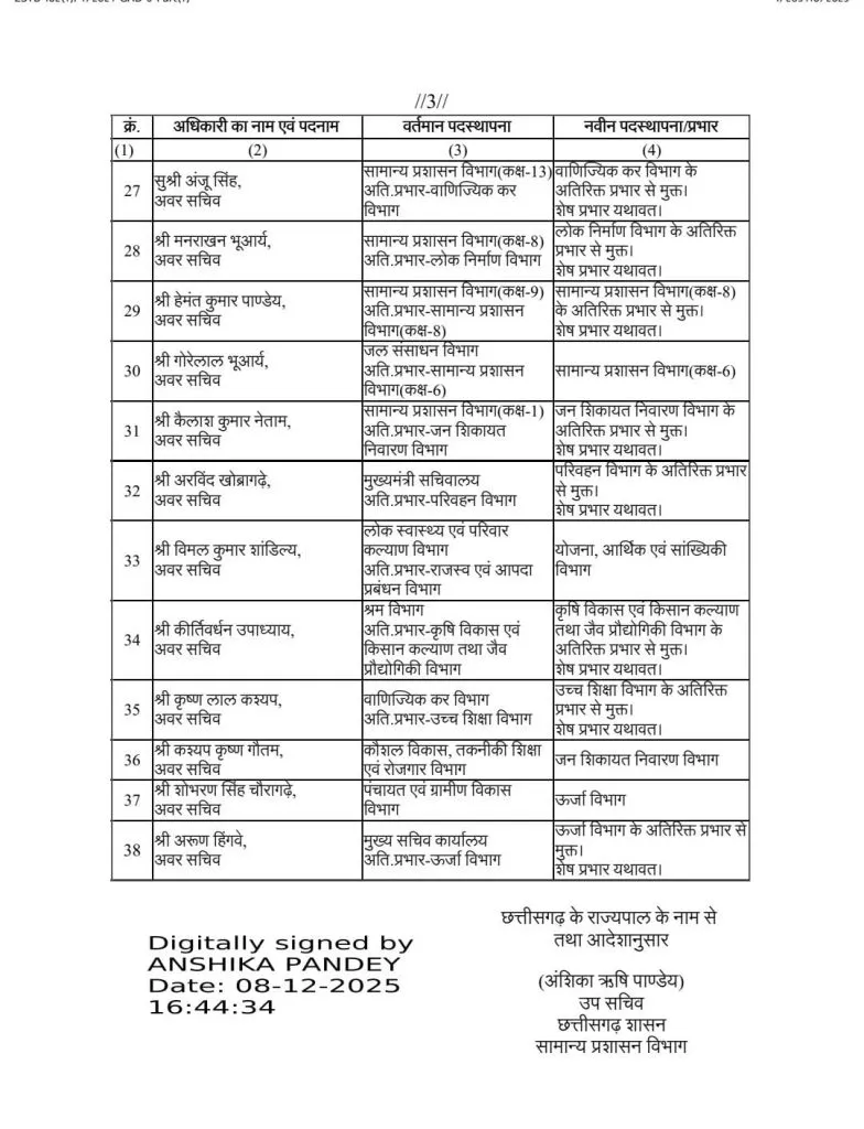 TRANSFER; छत्तीसगढ़ में बड़ा फेरबदल, राज्य प्रशासनिक सेवा के 38 अधिकारियों का तबादला