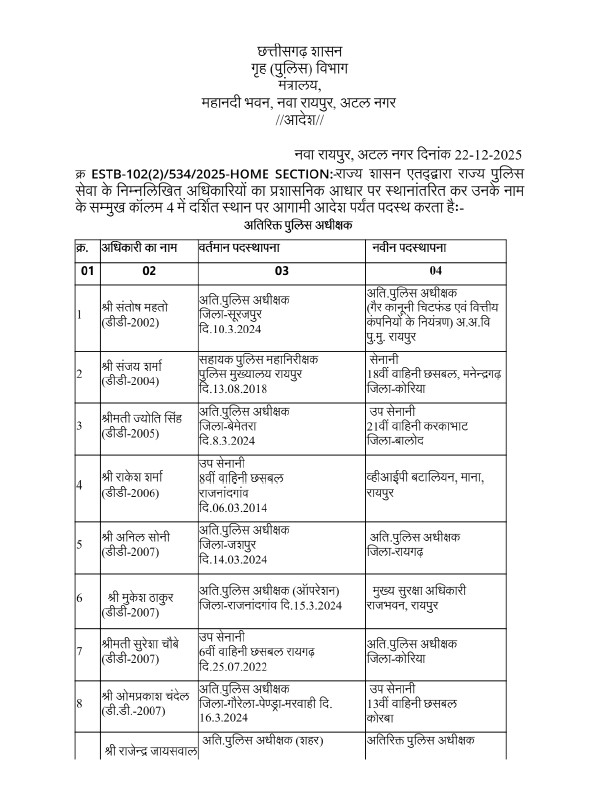 रायपुर, छत्तीसगढ़ सरकार ने पुलिस मकहमे में बड़ी सर्जरी करते हुए राज्य पुलिस सेवा के 95 अधिकारियों का ट्रांसफर किया है. गृह (पुलिस) विभाग की ओर से जारी आदेश के मुताबिक 35 ASP और 60 DSP स्तर के अफसरों को इधर से उधर किया गया है.