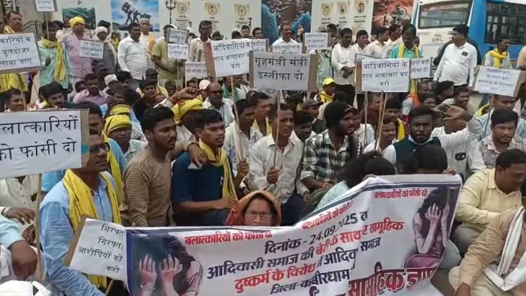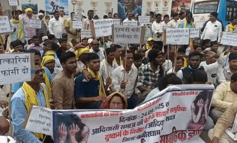 दुर्ग, आदिवासी युवती के साथ हुए सामूहिक बलात्कार की घटना के बाद गृहमंत्री विजय शर्मा के विधानसभा क्षेत्र कवर्धा में आक्रोश का माहौला है। आज आदिवासी समाज ने सड़क पर उतरकर पीड़िता को मुआवजा और आरोपियों की गिरफ्तारी की मांग को लेकर जोरदार प्रदर्शन किया। प्रदर्शन और धरना के कारण सिग्नल चौक पर यातायात ठप हो गया। प्रशासन को चेतावनी दी गई है कि अगर कार्रवाई नहीं हुई तो आंदोलन और उग्र होगा।