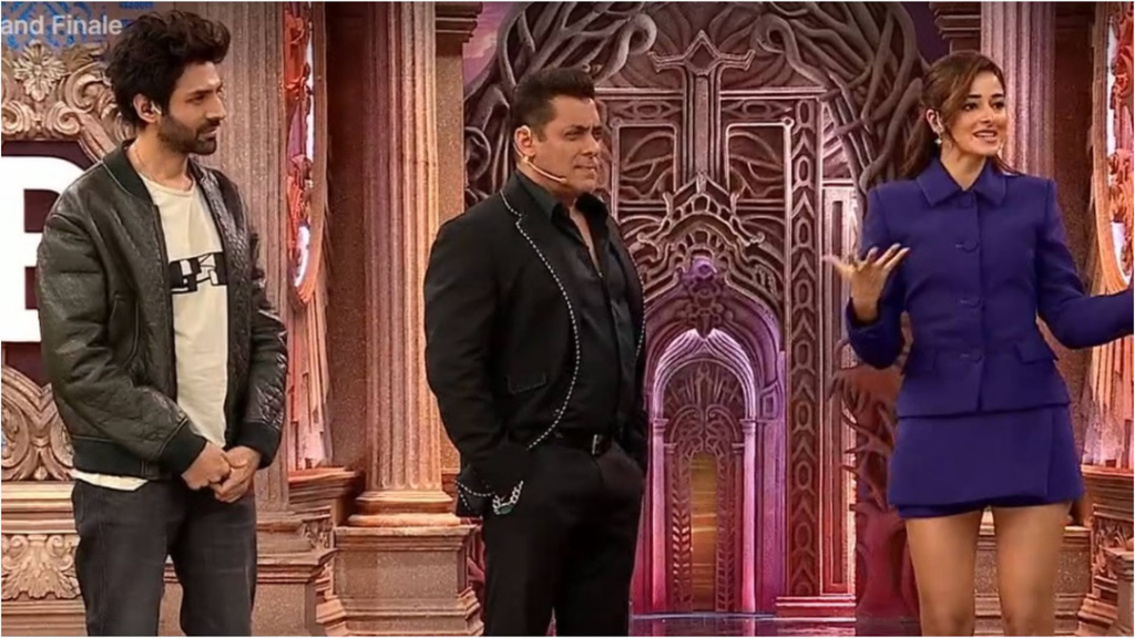 ‘बिग बॉस 19’ के फिनाले में कार्तिक आर्यन और अनन्या पांडे भी पहुंचे। वे यहां अपनी आगामी फिल्म ‘तू मेरी मैं तेरा, मैं तेरा तू मेरी’ के प्रमोशन के लिए पहुंचे। कार्तिक ने जैसे ही सलमान से कहा, ‘मेरी यह फिल्म आपकी फिल्म के साथ क्लैश हो रही है’। इस पर सलमान ने कहा, ‘चलिए आपके लिए हम बदल देंगे’। सलमान ने यहां कार्तिक को टंग ट्विस्टर दिया, ‘नीला नल, लाल नल’। इसे बोलते हुए कार्तिक उलझ गए, जिसे देख सलमान खूब हंसे। कार्तिक ने सलमान के साथ अपनी फिल्म का हुक स्टेप भी किया।