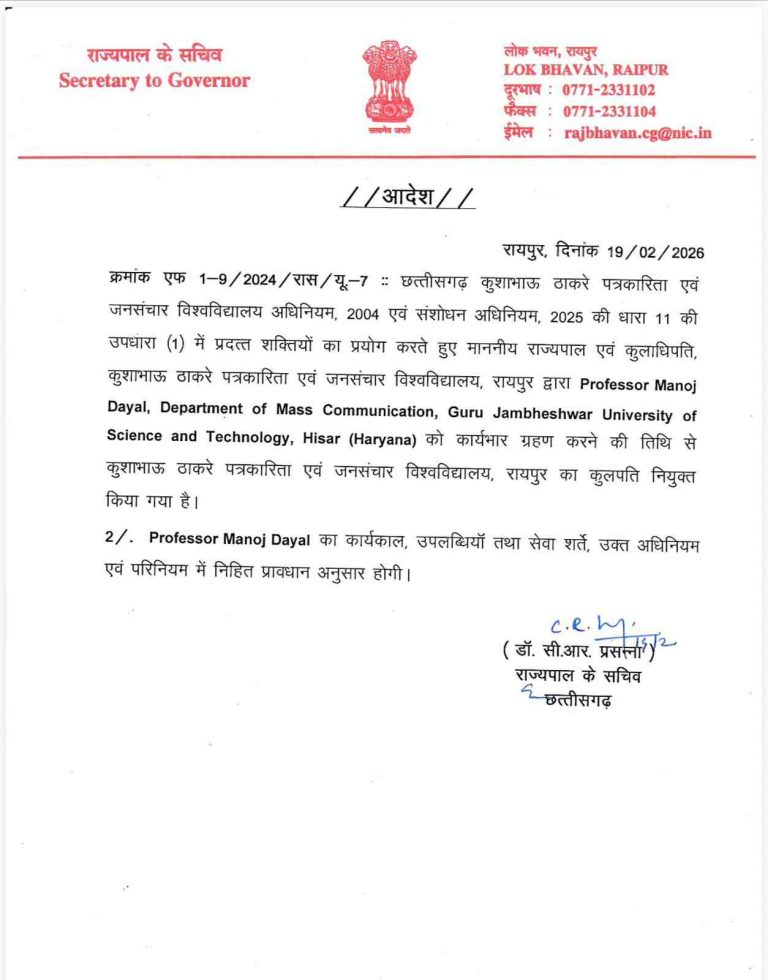 जारी आदेश में उल्लेखित है कि छत्तीसगढ़ कुशाभाऊ ठाकरे पत्रकारिता एवं जनसंचार विश्वविद्यालय अधिनियम, 2004 एवं संशोधन अधिनियम 2025 की धारा 11 की उपधारा (1) में प्रदत्त शक्तियों का प्रयोग करते हुए राज्यपाल एवं कुलाधिपति, कुशाभाऊ ठाकरे पत्रकारिता एवं जनसंचार विश्वविद्यालय, रायपुर द्वारा Professor Manoj Dayal, Department of Mass Communication, Guru Jambheshwar University of Science and Technology, Hisar (Haryana) को कार्यभार ग्रहण करने की तिथि से कुशाभाऊ ठाकरे पत्रकारिता एवं जनसंचार विश्वविद्यालय रायपुर का कुलपति नियुक्त किया गया है।उनका कार्यकाल, उपलब्धियां एवं सेवा शर्ते, उक्त अधिनियम एवं परिनियम में निहित प्रावधान अनुसार होगी। अभी कुलपति का प्रभार संभागायुक्त रायपुर आईएएस एमडी. कावरे के पास है।