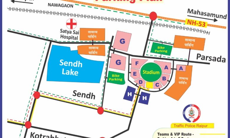 - बलौदाबाजार–खरोरा की ओर से स्टेडियम आने वाले दर्शकों के लिए मार्ग व्यवस्था : बलौदाबाजार–रायपुर मार्ग में विधानसभा ओवरब्रिज चौक से रिंग रोड नंबर-03 होकर विधानसभा चौक, राजू ढाबा रिंग रोड नंबर-03 जंक्शन होकर नेशनल हाईवे क्रमांक-53 से मंदिर हसौद होकर नवागांव से स्टेडियम टर्निंग होकर स्टेडियम के पूर्व दिशा स्थित परसदा पार्किंग एवं कोसा पार्किंग में अपना वाहन पार्क कर पैदल स्टेडियम पहुंचेंगे।